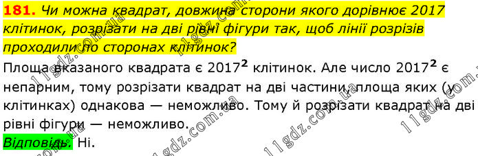 Чи можна квадрат, довжина сторони якого дорівнює 2017 клітинок, розрізати на дві рівні фігури так, щоб лінії розрізів проходили по сторонах клітинок? Площа вказаного квадрата є 20172 клітинок. Але число 20172 є непарним, тому розрізати квадрат на дві частини, площа яких (у клітинках) однакова — неможливо. Тому й розрізати квадрат на дві рівні фігури — неможливо. Відповідь. Ні.
