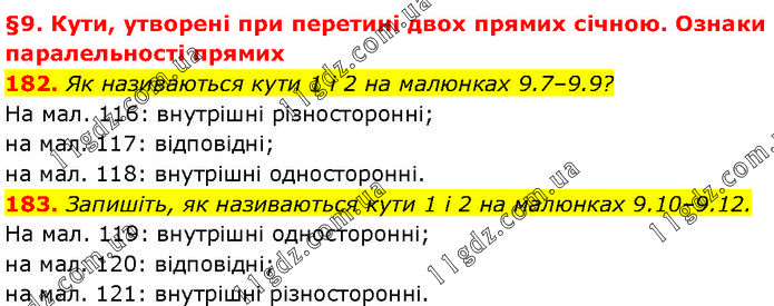 §9. Кути, утворені при перетині двох прямих січною. Ознаки паралельності прямих 182. Як називаються кути 1 і 2 на малюнках 9.7–9.9? На мал. 116: внутрішні різносторонні; на мал. 117: відповідні; на мал. 118: внутрішні односторонні. 183. Запишіть, як називаються кути 1 і 2 на малюнках 9.10–9.12. На мал. 119: внутрішні односторонні; на мал. 120: відповідні; на мал. 121: внутрішні різносторонні.