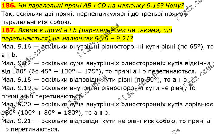 186. Чи паралельні прямі AB і CD на малюнку 9.15? Чому? Так, оскільки дві прямі, перпендикулярні до третьої прямої, паралельні між собою. 187. Якими є прямі а і b (паралельними чи такими, що перетинаються) на малюнках 9.16 – 9.21? Мал. 9.16 — оскільки внутрішні різносторонні кути рівні (по 65°), то а ∥ b. Мал. 9.17 — оскільки сума внутрішніх односторонніх кутів відмінна від 180° (бо 45° + 130° = 175°), то прямі а і b перетинаються. Мал. 9.18 — оскільки відповідні кути рівні (по 50°), то а ∥ b. Мал. 9.19 — оскільки внутрішні різносторонні кути не рівні, то прямі а і b перетинаються. Мал. 9.20 — оскільки сума внутрішніх односторонніх кутів дорівнює 180° (100° + 80° = 180°), то а ∥ b. Мал. 9.21 — оскільки відповідні кути не рівні між собою, то прямі а і b перетинаються.