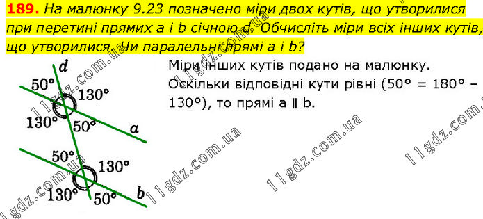 На малюнку 9.23 позначено міри двох кутів, що утворилися при перетині прямих а і b січною d. Обчисліть міри всіх інших кутів, що утворилися. Чи паралельні прямі а і b? Міри інших кутів подано на малюнку. Оскільки відповідні кути рівні (50° = 180° – 130°), то прямі а ∥ b.
