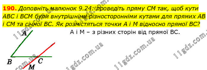 Доповніть малюнок 9.24: проведіть пряму CM так, щоб кути ABC і BCM були внутрішніми різносторонніми кутами для прямих AB і CM та січної BC. Як розмістяться точки A і M відносно прямої BC? A i M – з різних сторін від прямої BC.