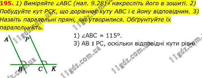 1) Виміряйте ∠ABC (мал. 9.28) і накресліть його в зошиті. 2) Побудуйте кут PCK, що дорівнює куту ABC і є йому відповідним. 3) Назвіть паралельні прямі, які утворилися. Обґрунтуйте їх паралельність. 1) ∠ABC = 115°. 3) AB ∥ PC, оскільки відповідні кути рівні.