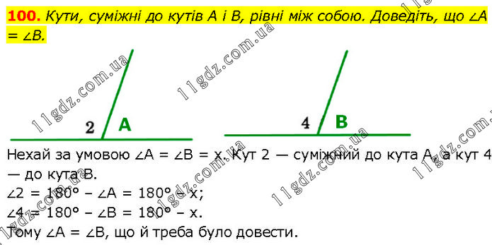 Кути, суміжні до кутів А і В, рівні між собою. Доведіть, що ∠A = ∠B. Нехай за умовою ∠А = ∠В = х. Кут 2 — суміжний до кута А, а кут 4 — до кута В. ∠2 = 180° – ∠А = 180° – х; ∠4 = 180° – ∠В = 180° – х. Тому ∠А = ∠В, що й треба було довести.