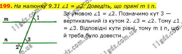 На малюнку 9.31 ∠1 = ∠2. Доведіть, що прямі m ∥ n. За умовою ∠1 = ∠2. Позначимо кут 3 — вертикальний із кутом 2. ∠3 = ∠2. Тому ∠1 = ∠3. Відповідні кути рівні, тому m ∥ n, що й треба було довести.