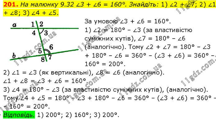 На малюнку 9.32 ∠3 + ∠6 = 160°. Знайдіть: 1) ∠2 + ∠7; 2) ∠1 + ∠8; 3) ∠4 + ∠5. За умовою ∠3 + ∠6 = 160°. 1) ∠2 = 180° – ∠3 (за властивістю суміжних кутів), ∠7 = 180° – ∠6 (аналогічно). Тому ∠2 + ∠7 = 180° – ∠3 + 180° – ∠6 = 360° – (∠3 + ∠6) = 360° – 160° = 200°. 2) ∠1 = ∠3 (як вертикальні), ∠8 = ∠6 (аналогічно). ∠1 + ∠8 = ∠3 + ∠6 = 160°. 3) ∠4 = 180° – ∠3 (за властивістю суміжних кутів), (аналогічно). Тому ∠4 + ∠5 = 180° – ∠3 + 180° – ∠6 = 360° – (∠3 + ∠6) = 360° – – 160° = 200°. Відповідь. 1) 200°; 2) 160°; 3) 200°.