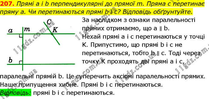 Прямі а і b перпендикулярні до прямої m. Пряма с перетинає пряму а. Чи перетинаються прямі b і с? Відповідь обґрунтуйте. За наслідком з ознаки паралельності прямих отримаємо, що a ∥ b. Нехай прямі a і c перетинаються у точці K. Припустимо, що прямі b і с не перетинаються, тобто b ∥ с. Тоді через точку К проходять дві прямі а і с, паралельні прямій b. Це суперечить аксіомі паралельності прямих. Наше припущення хибне. Прямі b і с перетинаються. Відповідь: прямі b і с перетинаються.