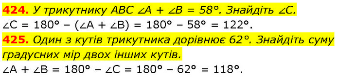 424. У трикутнику ABC ∠A + ∠B = 58°. Знайдіть ∠С. ∠C = 180° – (∠A + ∠B) = 180° – 58° = 122°. 425. Один з кутів трикутника дорівнює 62°. Знайдіть суму градусних мір двох інших кутів. ∠A + ∠B = 180° – ∠C = 180° – 62° = 118°.