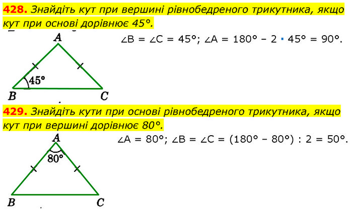428. Знайдіть кут при вершині рівнобедреного трикутника, якщо кут при основі дорівнює 45°. ∠B = ∠C = 45°; ∠A = 180° – 2 ∙ 45° = 90°. 429. Знайдіть кути при основі рівнобедреного трикутника, якщо кут при вершині дорівнює 80°. ∠А = 80°; ∠В = ∠С = (180° – 80°) : 2 = 50°.