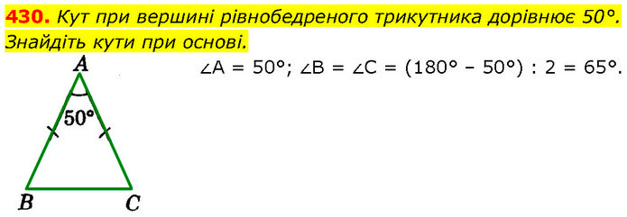 Кут при вершині рівнобедреного трикутника дорівнює 50°. Знайдіть кути при основі. ∠А = 50°; ∠В = ∠С = (180° – 50°) : 2 = 65°.