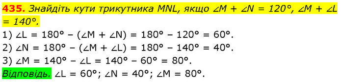 Знайдіть кути трикутника MNL, якщо ∠M + ∠N = 120°, ∠M + ∠L = 140°. 1) ∠L = 180° – (∠M + ∠N) = 180° – 120° = 60°. 2) ∠N = 180° – (∠M + ∠L) = 180° – 140° = 40°. 3) ∠M = 140° – ∠L = 140° – 60° = 80°. Відповідь. ∠L = 60°; ∠N = 40°; ∠M = 80°.