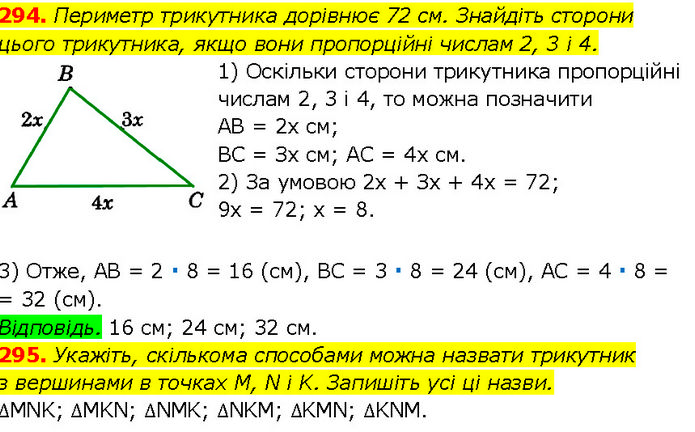294. Периметр трикутника дорівнює 72 см. Знайдіть сторони цього трикутника, якщо вони пропорційні числам 2, 3 і 4. 1) Оскільки сторони трикутника пропорційні числам 2, 3 і 4, то можна позначити AB = 2х см; BC = Зх см; AC = 4х см. 2) За умовою 2х + Зх + 4х = 72; 9х = 72; х = 8. 3) Отже, AB = 2 ∙ 8 = 16 (см), BC = 3 ∙ 8 = 24 (см), AC = 4 ∙ 8 = = 32 (см). Відповідь. 16 см; 24 см; 32 см. 295. Укажіть, скількома способами можна назвати трикутник з вершинами в точках М, N і K. Запишіть усі ці назви. ∆MNK; ∆MKN; ∆NMK; ∆NKM; ∆KMN; ∆KNM.