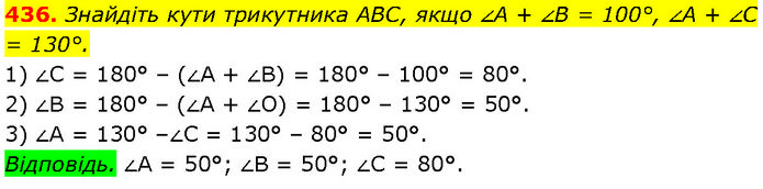 Знайдіть кути трикутника ABC, якщо ∠A + ∠B = 100°, ∠A + ∠C = 130°. 1) ∠C = 180° – (∠A + ∠B) = 180° – 100° = 80°. 2) ∠B = 180° – (∠A + ∠O) = 180° – 130° = 50°. 3) ∠A = 130° –∠C = 130° – 80° = 50°. Відповідь. ∠A = 50°; ∠B = 50°; ∠C = 80°.