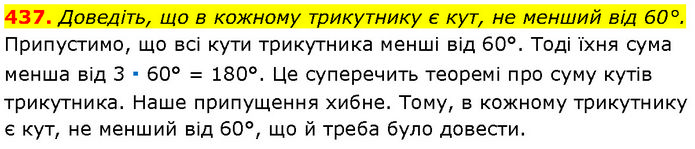 Доведіть, що в кожному трикутнику є кут, не менший від 60°. Припустимо, що всі кути трикутника менші від 60°. Тоді їхня сума менша від 3 ∙ 60° = 180°. Це суперечить теоремі про суму кутів трикутника. Наше припущення хибне. Тому, в кожному трикутнику є кут, не менший від 60°, що й треба було довести.