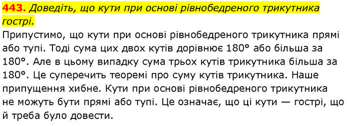 Доведіть, що кути при основі рівнобедреного трикутника гострі. Припустимо, що кути при основі рівнобедреного трикутника прямі або тупі. Тоді сума цих двох кутів дорівнює 180° або більша за 180°. Але в цьому випадку сума трьох кутів трикутника більша за 180°. Це суперечить теоремі про суму кутів трикутника. Наше припущення хибне. Кути при основі рівнобедреного трикутника не можуть бути прямі або тупі. Це означає, що ці кути — гострі, що й треба було довести.