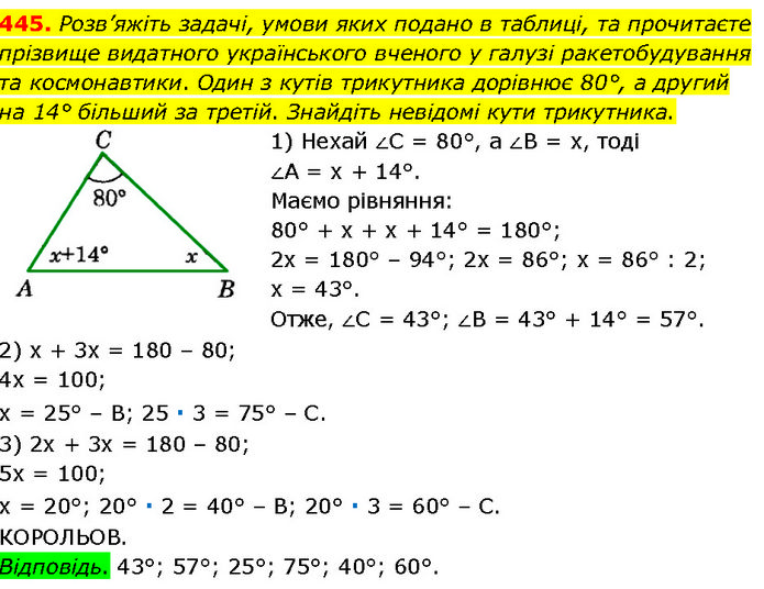 Розв’яжіть задачі, умови яких подано в таблиці, та прочитаєте прізвище видатного українського вченого у галузі ракетобудування та космонавтики. Один з кутів трикутника дорівнює 80°, а другий на 14° більший за третій. Знайдіть невідомі кути трикутника. 1) Нехай ∠C = 80°, a ∠B = х, тоді ∠A = х + 14°. Маємо рівняння: 80° + х + х + 14° = 180°; 2х = 180° – 94°; 2х = 86°; х = 86° : 2; х = 43°. Отже, ∠С = 43°; ∠В = 43° + 14° = 57°. 2) х + 3х = 180 – 80; 4х = 100; х = 25° – В; 25 ∙ 3 = 75° – С. 3) 2х + 3х = 180 – 80; 5х = 100; х = 20°; 20° ∙ 2 = 40° – В; 20° ∙ 3 = 60° – С. КОРОЛЬОВ. Відповідь. 43°; 57°; 25°; 75°; 40°; 60°.