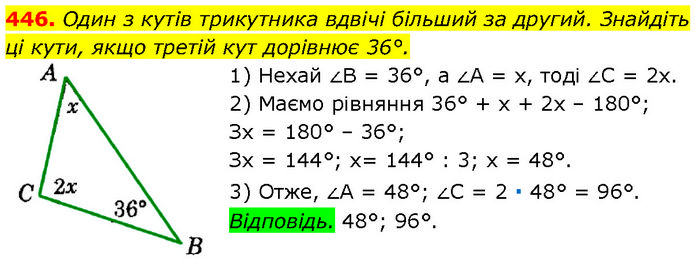 Один з кутів трикутника вдвічі більший за другий. Знайдіть ці кути, якщо третій кут дорівнює 36°. 1) Нехай ∠B = 36°, a ∠A = х, тоді ∠C = 2х. 2) Маємо рівняння 36° + х + 2х – 180°; Зх = 180° – 36°; Зх = 144°; х= 144° : 3; x = 48°. 3) Отже, ∠A = 48°; ∠C = 2 ∙ 48° = 96°. Відповідь. 48°; 96°.