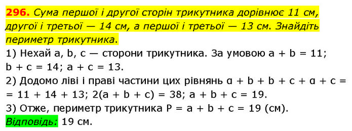 Сума першої і другої сторін трикутника дорівнює 11 см, другої і третьої — 14 см, а першої і третьої — 13 см. Знайдіть периметр трикутника. 1) Нехай а, b, с — сторони трикутника. За умовою a + b = 11; b + с = 14; а + с = 13. 2) Додомо ліві і праві частини цих рівнянь α + b + b + c + α + c = = 11 + 14 + 13; 2(a + b + с) = 38; а + b + с = 19. 3) Отже, периметр трикутника Р = а + b + с = 19 (см). Відповідь: 19 см.