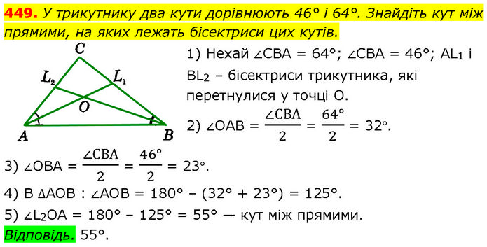 У трикутнику два кути дорівнюють 46° і 64°. Знайдіть кут між прямими, на яких лежать бісектриси цих кутів. 1) Нехай ∠СВА = 64°; ∠СВА = 46°; AL1 і BL2 – бісектриси трикутника, які перетнулися у точці О. 2) ∠ОАВ = (∠СВА)/2 = (64°)/2 = 32°. 3) ∠ОВА = (∠СВА)/2 = (46°)/2 = 23°. 4) В ∆AOB : ∠AOB = 180° – (32° + 23°) = 125°. 5) ∠L2OA = 180° – 125° = 55° — кут між прямими. Відповідь. 55°.