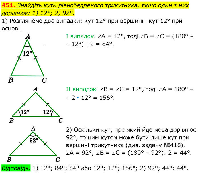Знайдіть кути рівнобедреного трикутника, якщо один з них дорівнює: 1) 12°; 2) 92°. 1) Розглянемо два випадки: кут 12° при вершині і кут 12° при основі. І випадок. ∠A = 12°, тоді ∠B = ∠C = (180° – – 12°) : 2 = 84°. II випадок. ∠B = ∠C = 12°, тоді ∠A = 180° – – 2 ∙ 12° = 156°. 2) Оскільки кут, про який йде мова дорівнює 92°, то цим кутом може бути лише кут при вершині трикутника (див. задачу №418). ∠A = 92°; ∠B = ∠C = (180° – 92°): 2 = 44°. Відповідь. 1) 12°; 84°; 84° або 12°; 12°; 156°; 2) 92°; 44°; 44°.