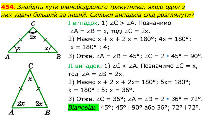 Знайдіть кути рівнобедреного трикутника, якщо один з них удвічі більший за інший. Скільки випадків слід розглянути? І випадок. 1) ∠C > ∠A. Позначимо ∠A = ∠B = х, тоді ∠C = 2х. 2) Маємо x + x + 2 x = 180°; 4x = 180°; х = 180° : 4; 3) Отже, ∠A = ∠B = 45°; ∠C = 2 ∙ 45° = 90°. ІІ випадок. 1) ∠C < ∠A. Позначимо ∠C = х, тоді ∠A = ∠B = 2x. 2) Маємо х + 2 х + 2х= 180°; 5х= 180°; х = 180° : 5; х = 36°. 3) Отже, ∠C = 36°; ∠A = ∠B = 2 ∙ 36° = 72°. Відповідь. 45°; 45° і 90° або 36°; 72° і 72°.