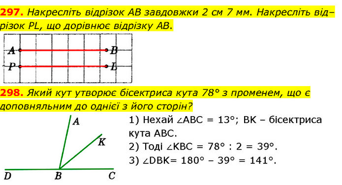 297. Накресліть відрізок AB завдовжки 2 см 7 мм. Накресліть від– різок PL, що дорівнює відрізку AB. 298. Який кут утворює бісектриса кута 78° з променем, що є доповняльним до однієї з його сторін? 1) Нехай ∠ABC = 13°; BK – бісектриса кута ABC. 2) Тоді ∠KBC = 78° : 2 = 39°. 3) ∠DBK= 180° – 39° = 141°.