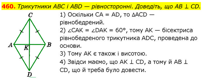 Трикутники ABC і ABD — рівносторонні. Доведіть, що AB ⊥ CD. 1) Оскільки CA = AD, то ∆ACD — рівнобедрений. 2) ∠САК = ∠DAK = 60°, тому AK — бісектриса рівнобедреного трикутника ADC, проведена до основи. 3) Тому АК є також і висотою. 4) Звідси маємо, що AK ⊥ CD, а тому й AB ⊥ CD, що й треба було довести.