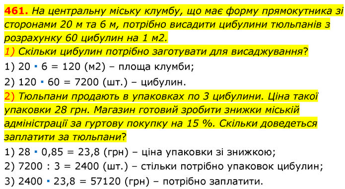 На центральну міську клумбу, що має форму прямокутника зі сторонами 20 м та 6 м, потрібно висадити цибулини тюльпанів з розрахунку 60 цибулин на 1 м2. 1) Скільки цибулин потрібно заготувати для висаджування? 1) 20 ∙ 6 = 120 (м2) – площа клумби; 2) 120 ∙ 60 = 7200 (шт.) – цибулин. 2) Тюльпани продають в упаковках по 3 цибулини. Ціна такої упаковки 28 грн. Магазин готовий зробити знижки міській адміністрації за гуртову покупку на 15 %. Скільки доведеться заплатити за тюльпани? 1) 28 ∙ 0,85 = 23,8 (грн) – ціна упаковки зі знижкою; 2) 7200 : 3 = 2400 (шт.) – стільки потрібно упаковок цибулин; 3) 2400 ∙ 23,8 = 57120 (грн) – потрібно заплатити.