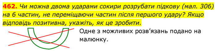 Чи можна двома ударами сокири розрубати підкову (мал. 306) на 6 частин, не переміщаючи частин після першого удару? Якщо відповідь позитивна, укажіть, як це зробити. Одне з можливих розв’язань подано на малюнку.