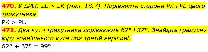470. У ΔPLK ∠L > ∠K (мал. 18.7). Порівняйте сторони PK і PL цього трикутника. PK > PL. 471. Два кути трикутника дорівнюють 62° і 37°. Знайдіть градусну міру зовнішнього кута при третій вершині. 62° + 37° = 99°.