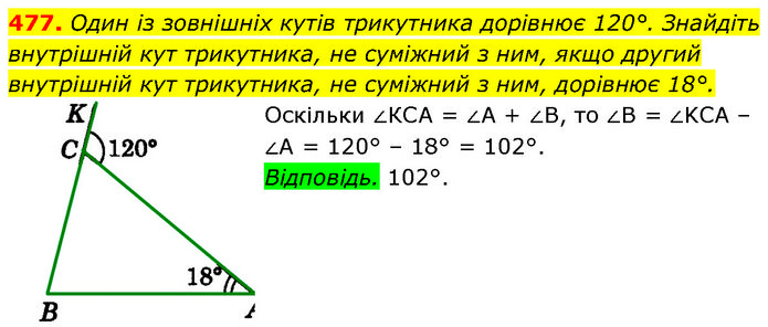 Один із зовнішніх кутів трикутника дорівнює 120°. Знайдіть внутрішній кут трикутника, не суміжний з ним, якщо другий внутрішній кут трикутника, не суміжний з ним, дорівнює 18°. Оскільки ∠КCA = ∠A + ∠B, то ∠B = ∠KCA – ∠A = 120° – 18° = 102°. Відповідь. 102°.