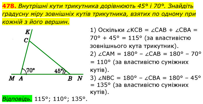Внутрішні кути трикутника дорівнюють 45° і 70°. Знайдіть градусну міру зовнішніх кутів трикутника, взятих по одному при кожній з його вершин. 1) Оскільки ∠KCB = ∠CAB + ∠CBA = 70° + 45° = 115° (за властивістю зовнішнього кута трикутник). 2) ∠CAM = 180° – ∠CAB = 180° – 70° = 110° (за властивістю суміжних кутів). 3) ∠NBC = 180° – ∠CBA = 180° – 45° = 135° (за властивістю суміжних кутів). Відповідь. 115°; 110°; 135°.