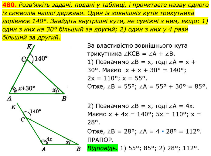 Розв’яжіть задачі, подані у таблиці, і прочитаєте назву одного із символів нашої держави. Один із зовнішніх кутів трикутника дорівнює 140°. Знайдіть внутрішні кути, не суміжні з ним, якщо: 1) один з них на 30° більший за другий; 2) один з них у 4 рази більший за другий. За властивістю зовнішнього кута трикутника ∠KCB = ∠A + ∠B. 1) Позначимо ∠B = х, тоді ∠A = х + 30°. Маємо х + х + 30° = 140°; 2х = 110°; х = 55°. Отже, ∠B = 55°; ∠A = 55° + 30° = 85°. 2) Позначимо ∠B = х, тоді ∠A = 4х. Маємо х + 4х = 140°; 5x = 110°; x = 28°. Отже, ∠B = 28°; ∠A = 4 ∙ 28° = 112°. ПРАПОР. Відповідь. 1) 55°; 85°; 2) 28°; 112°.