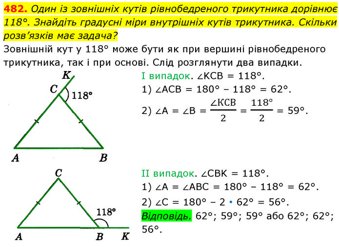 Один із зовнішніх кутів рівнобедреного трикутника дорівнює 118°. Знайдіть градусні міри внутрішніх кутів трикутника. Скільки розв’язків має задача? Зовнішній кут у 118° може бути як при вершині рівнобедреного трикутника, так і при основі. Слід розглянути два випадки. І випадок. ∠KCB = 118°. 1) ∠ACB = 180° – 118° = 62°. 2) ∠A = ∠B = (∠КСВ)/2 = (118°)/2 = 59°. II випадок. ∠CBK = 118°. 1) ∠A = ∠ABC = 180° – 118° = 62°. 2) ∠C = 180° – 2 ∙ 62° = 56°. Відповідь. 62°; 59°; 59° або 62°; 62°; 56°.