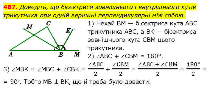 Доведіть, що бісектриси зовнішнього і внутрішнього кутів трикутника при одній вершині перпендикулярні між собою. 1) Нехай BM — бісектриса кута ABC трикутника ABC, a BK — бісектриса зовнішнього кута CBM цього трикутника. 2) ∠ABC + ∠CBM = 180°. 3) ∠MBK = ∠MBC + ∠CBK = (∠АВС)/2 + (∠СВМ)/2 = (∠АВС + ∠СВМ)/2 = (180°)/2 = = 90°. Тобто МВ ⊥ ВК, що й треба було довести.