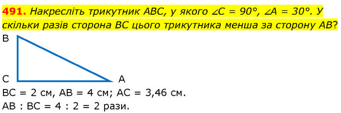 Накресліть трикутник ABC, у якого ∠C = 90°, ∠A = 30°. У скільки разів сторона BC цього трикутника менша за сторону AB? ВС = 2 см, АВ = 4 см; АС = 3,46 см. АВ : ВС = 4 : 2 = 2 рази.