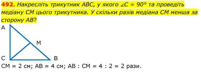 Накресліть трикутник ABC, у якого ∠C = 90° та проведіть медіану CM цього трикутника. У скільки разів медіана CM менша за сторону AB? СМ = 2 см; АВ = 4 см; АВ : СМ = 4 : 2 = 2 рази.