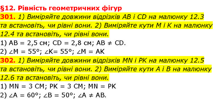§12. Рівність геометричних фігур 301. 1) Виміряйте довжини відрізків AB і CD на малюнку 12.3 та встановіть, чи рівні вони. 2) Виміряйте кути M і K на малюнку 12.4 та встановіть, чи рівні вони. 1) AB = 2,5 см; CD = 2,8 см; AB ≠ CD. 2) ∠M = 55°; ∠K= 55°; ∠M = AK 302. 1) Виміряйте довжини відрізків MN і PK на малюнку 12.5 та встановіть, чи рівні вони. 2) Виміряйте кути А і В на малюнку 12.6 та встановіть, чи рівні вони. 1) MN = 3 CM; PK = 3 CM; MN = PK 2) ∠A = 60°; ∠B = 50°; ∠A ≠ AB.