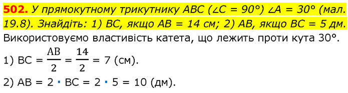 У прямокутному трикутнику ABC (∠C = 90°) ∠A = 30° (мал. 19.8). Знайдіть: 1) BC, якщо AB = 14 см; 2) AB, якщо BC = 5 дм. Використовуємо властивість катета, що лежить проти кута 30°. 1) ВС = АВ/2 = 14/2 = 7 (см). 2) АВ = 2 ∙ ВС = 2 ∙ 5 = 10 (дм).