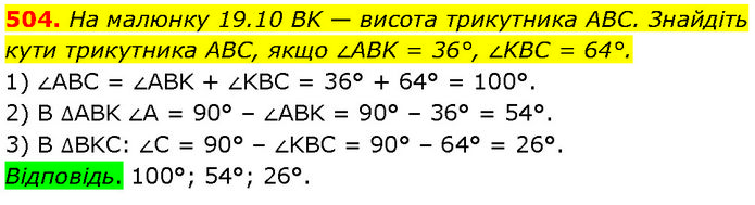 На малюнку 19.10 BK — висота трикутника ABC. Знайдіть кути трикутника ABC, якщо ∠ABK = 36°, ∠KBC = 64°. 1) ∠ABC = ∠ABK + ∠KBC = 36° + 64° = 100°. 2) В ∆ABK ∠A = 90° – ∠ABK = 90° – 36° = 54°. 3) В ∆BKC: ∠C = 90° – ∠KBC = 90° – 64° = 26°. Відповідь. 100°; 54°; 26°.