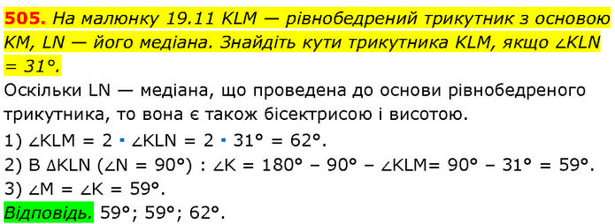 На малюнку 19.11 KLM — рівнобедрений трикутник з основою KM, LN — його медіана. Знайдіть кути трикутника KLM, якщо ∠KLN = 31°. Оскільки LN — медіана, що проведена до основи рівнобедреного трикутника, то вона є також бісектрисою і висотою. 1) ∠KLM = 2 ∙ ∠KLN = 2 ∙ 31° = 62°. 2) В ∆KLN (∠N = 90°) : ∠K = 180° – 90° – ∠KLM= 90° – 31° = 59°. 3) ∠M = ∠K = 59°. Відповідь. 59°; 59°; 62°.