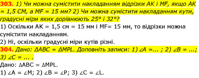 303. 1) Чи можна сумістити накладанням відрізки AK і MF, якщо AK = 1,5 CM, a MF = 15 мм? 2) Чи можна сумістити накладанням кути, градусні міри яких дорівнюють 25° і 32°? 1) Оскільки AK = 1,5 см = 15 мм і MF= 15 мм, то відрізки можна сумістити накладанням. 2) Ні, оскільки градусні міри кутів різні. 304. Дано: ΔABC = ΔMPL. Доповніть записи: 1) ∠A =... ; 2) ∠B = ...; 3) ∠C = ... . Дано: ∆ABC = ∆MPL. 1) ∠A = ∠M; 2) ∠B = ∠Р; 3) ∠C = ∠L.