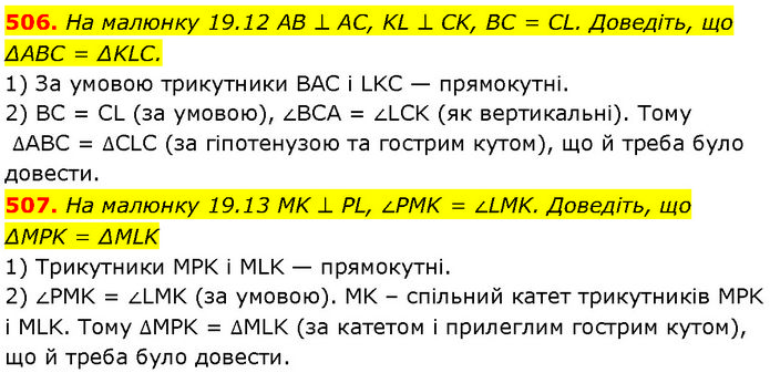 506. На малюнку 19.12 AB ⊥ AC, KL ⊥ CK, BC = CL. Доведіть, що ΔABC = ΔKLC. 1) За умовою трикутники ВАС і LKC — прямокутні. 2) BC = CL (за умовою), ∠BCA = ∠LCK (як вертикальні). Тому ∆ABC = ∆CLC (за гіпотенузою та гострим кутом), що й треба було довести. 507. На малюнку 19.13 MK ⊥ PL, ∠PMK = ∠LMK. Доведіть, що ΔMPK = ΔMLK 1) Трикутники MPK і MLK — прямокутні. 2) ∠PMK = ∠LMK (за умовою). MK – спільний катет трикутників MPK і MLK. Тому ∆MPK = ∆MLK (за катетом і прилеглим гострим кутом), що й треба було довести.