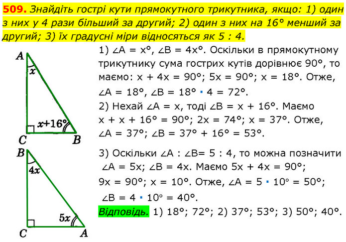 Знайдіть гострі кути прямокутного трикутника, якщо: 1) один з них у 4 рази більший за другий; 2) один з них на 16° менший за другий; 3) їх градусні міри відносяться як 5 : 4. 1) ∠A = х°, ∠B = 4х°. Оскільки в прямокутному трикутнику сума гострих кутів дорівнює 90°, то маємо: х + 4х = 90°; 5х = 90°; х = 18°. Отже, ∠A = 18°, ∠B = 18° ∙ 4 = 72°. 2) Нехай ∠A = х, тоді ∠B = х + 16°. Маємо х + х + 16° = 90°; 2х = 74°; х = 37°. Отже, ∠A = 37°; ∠B = 37° + 16° = 53°. 3) Оскільки ∠A : ∠B= 5 : 4, то можна позначити ∠A = 5х; ∠B = 4х. Маємо 5х + 4х = 90°; 9х = 90°; х = 10°. Отже, ∠A = 5 ∙ 10° = 50°; ∠B = 4 ∙ 10° = 40°. Відповідь. 1) 18°; 72°; 2) 37°; 53°; 3) 50°; 40°.