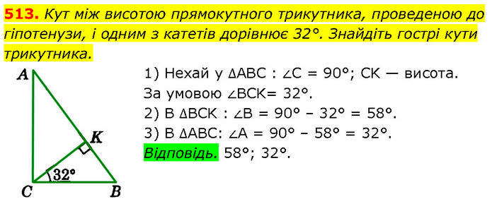 Кут між висотою прямокутного трикутника, проведеною до гіпотенузи, і одним з катетів дорівнює 32°. Знайдіть гострі кути трикутника. 1) Нехай у ∆АВС : ∠C = 90°; CK — висота. За умовою ∠BCK= 32°. 2) В ∆BCK : ∠B = 90° – 32° = 58°. 3) В ∆АВС: ∠A = 90° – 58° = 32°. Відповідь. 58°; 32°.