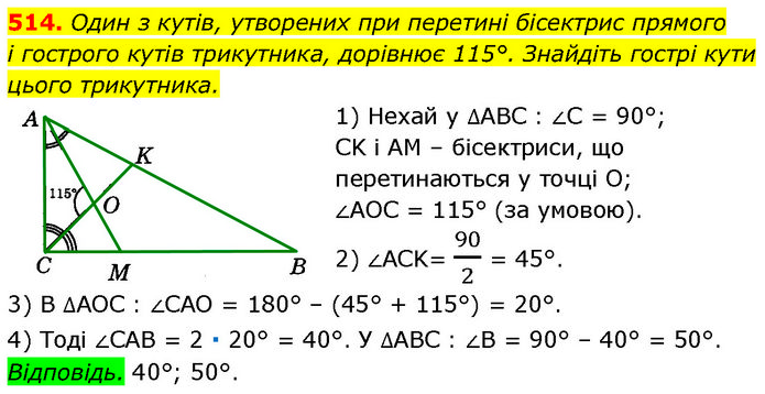 Один з кутів, утворених при перетині бісектрис прямого і гострого кутів трикутника, дорівнює 115°. Знайдіть гострі кути цього трикутника. 1) Нехай у ∆ABC : ∠C = 90°; CK і AM – бісектриси, що перетинаються у точці О; ∠AOC = 115° (за умовою). 2) ∠ACK= 90/2 = 45°. 3) В ∆AOC : ∠CAO = 180° – (45° + 115°) = 20°. 4) Тоді ∠CAB = 2 ∙ 20° = 40°. У ∆ABC : ∠B = 90° – 40° = 50°. Відповідь. 40°; 50°.