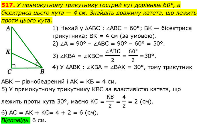 У прямокутному трикутнику гострий кут дорівнює 60°, а бісектриса цього кута — 4 см. Знайдіть довжину катета, що лежить проти цього кута. 1) Нехай у ∆ABC : ∠ABC = 60°; BK — бісектриса трикутника; BK = 4 см (за умовою). 2) ∠A = 90° – ∠ABC = 90° – 60° = 30°. 3) ∠KBA = ∠KBC= (∠АВС)/2 = (60°)/2 =30°. 4) У ∆ABK : ∠KBA = ∠BAK = 30°, тому трикутник ABK — рівнобедрений і AK = KB = 4 см. 5) У прямокутному трикутнику KBC за властивістю катета, що лежить проти кута 30°, маємо KC = КВ/2 = 4/2 = 2 (см). 6) AC = AK + KC= 4 + 2 = 6 (см). Відповідь. 6 см.