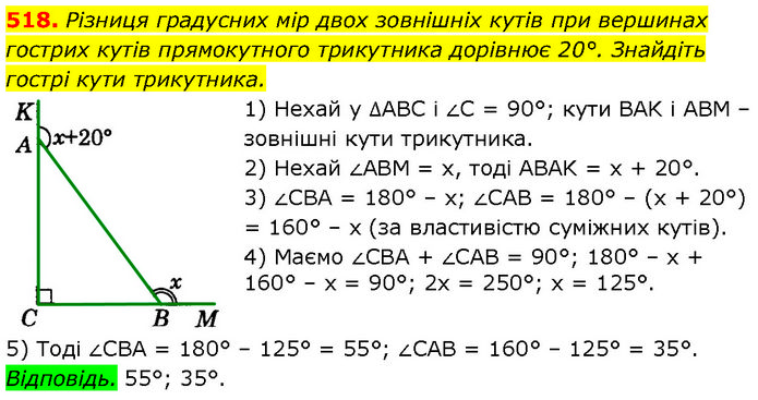 Різниця градусних мір двох зовнішніх кутів при вершинах гострих кутів прямокутного трикутника дорівнює 20°. Знайдіть гострі кути трикутника. 1) Нехай у ∆ABC i ∠C = 90°; кути BAK і ABM – зовнішні кути трикутника. 2) Нехай ∠ABM = х, тоді ABAK = х + 20°. 3) ∠CBA = 180° – х; ∠CAB = 180° – (х + 20°) = 160° – х (за властивістю суміжних кутів). 4) Маємо ∠CBA + ∠CAB = 90°; 180° – х + 160° – х = 90°; 2х = 250°; х = 125°. 5) Тоді ∠CBA = 180° – 125° = 55°; ∠CAB = 160° – 125° = 35°. Відповідь. 55°; 35°.