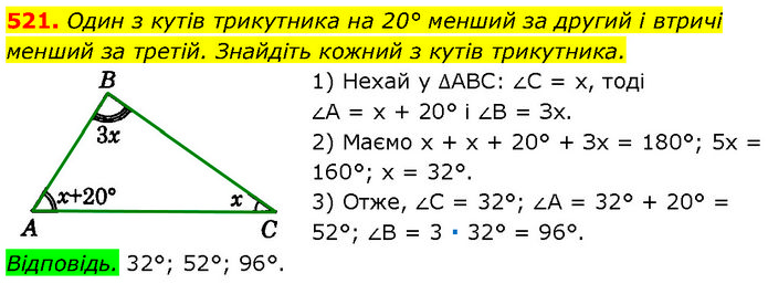 Один з кутів трикутника на 20° менший за другий і втричі менший за третій. Знайдіть кожний з кутів трикутника. 1) Нехай у ∆ABC: ∠C = х, тоді ∠A = х + 20° і ∠B = Зх. 2) Маємо х + х + 20° + Зх = 180°; 5х = 160°; х = 32°. 3) Отже, ∠C = 32°; ∠A = 32° + 20° = 52°; ∠B = 3 ∙ 32° = 96°. Відповідь. 32°; 52°; 96°.