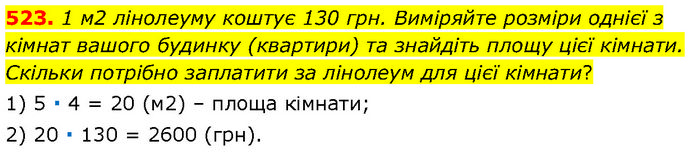 1 м2 лінолеуму коштує 130 грн. Виміряйте розміри однієї з кімнат вашого будинку (квартири) та знайдіть площу цієї кімнати. Скільки потрібно заплатити за лінолеум для цієї кімнати? 1) 5 ∙ 4 = 20 (м2) – площа кімнати; 2) 20 ∙ 130 = 2600 (грн).