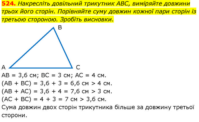 Накресліть довільний трикутник ABC, виміряйте довжини трьох його сторін. Порівняйте суму довжин кожної пари сторін із третьою стороною. Зробіть висновки. АВ = 3,6 см; ВС = 3 см; АС = 4 см. (АВ + ВС) = 3,6 + 3 = 6,6 см > 4 см. (AB + AC) = 3,6 + 4 = 7,6 см > 3 см. (AC + BC) = 4 + 3 = 7 см > 3,6 см. Сума довжин двох сторін трикутника більше за довжину третьої сторони.